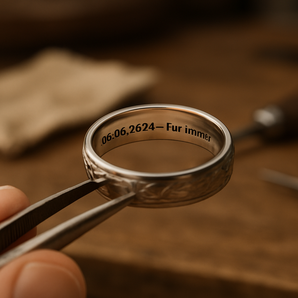 | Maschinelle Gravur | Robust, tiefe Gravuren, kosteneffizient | Breite Ringe, Außengravuren mit Haptik |